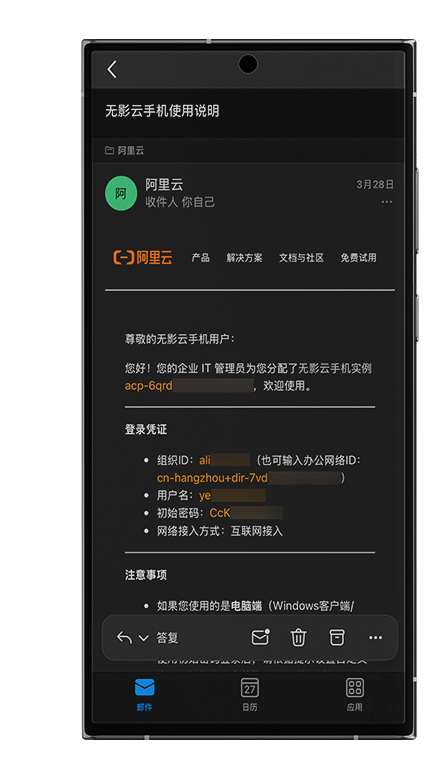 在可以登录无影云手机Android客户端之前,首先需要准备好你的登录凭证。当无影云手机管理员为你分配云手机后,系统会自动发送通知邮件或短信,登录凭证即包含在其中。